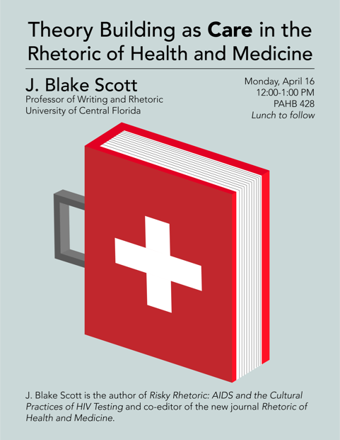 On Monday, April 16, 2018, J. Blake Scott of the University of Central Florida will deliver a talk entitled, "Theory Building as Care in the Rhetoric of Health and Medicine," as part of the Eminent Scholars Program at UMBC. The event, which will take place in the Performing Arts and Humanities Building, Room 428 at 12:00 PM, will examine the following: "More than a tool or lens to engage the world, theory emerges from and co-enacts phenomena and their entanglements. This presentation will discuss and illustrate a methodology of theory building in the rhetoric of health and medicine (RHM), a multi-disciplinary field concerned with how symbolic persuasion shapes meaning and experience in health and medical practices. The presentation will also argue for and raise questions about theory building as a form of care, a way of engaging that has particular implications for studies of health and medicine but also implications for theorizing more broadly." This event will be an exciting and informational event; we look forward to seeing you there.